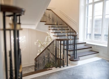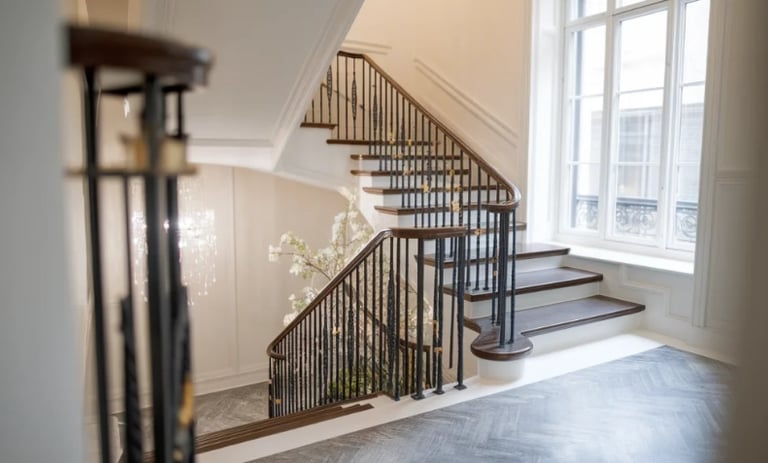 Escaliers et couloirs : sols, rampes, moquettes et zones de contact.